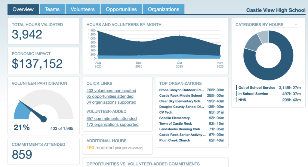 Since August Castle View HS students have completed 3,942 hours of community service. The organizations the students have dedicated the most time to are Stone Canyon Outdoor EdVentures, Castle Rock Middle School, and Clear Sky Elementary School.