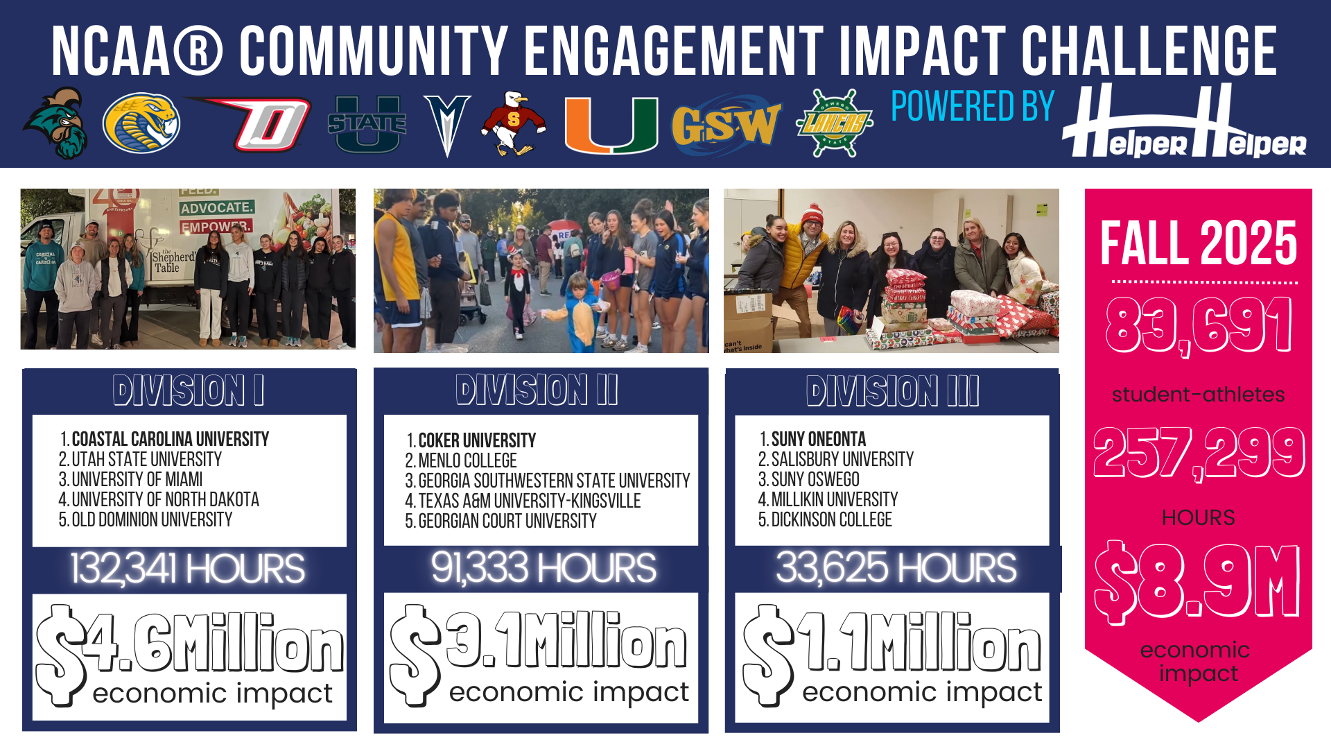 In Fall 2025, Coastal Carolina finished #1 in Division I in the NCAA Community Engagement Service Challenge, ahead of Utah State University, University of Miami, University of North Dakota, and Old Dominion University.