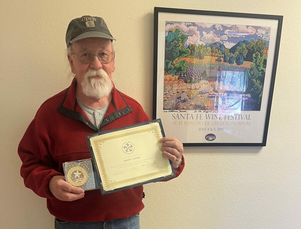 Mr. Jerry Kerr was honored with the award by El Rancho de Las Golondrinas. He volunteers almost every week as a  tour guide and he is on the A-List/ “Varsity Team” of wonderful incredibly dedicated volunteers at El Rancho de Las Golondrinas.