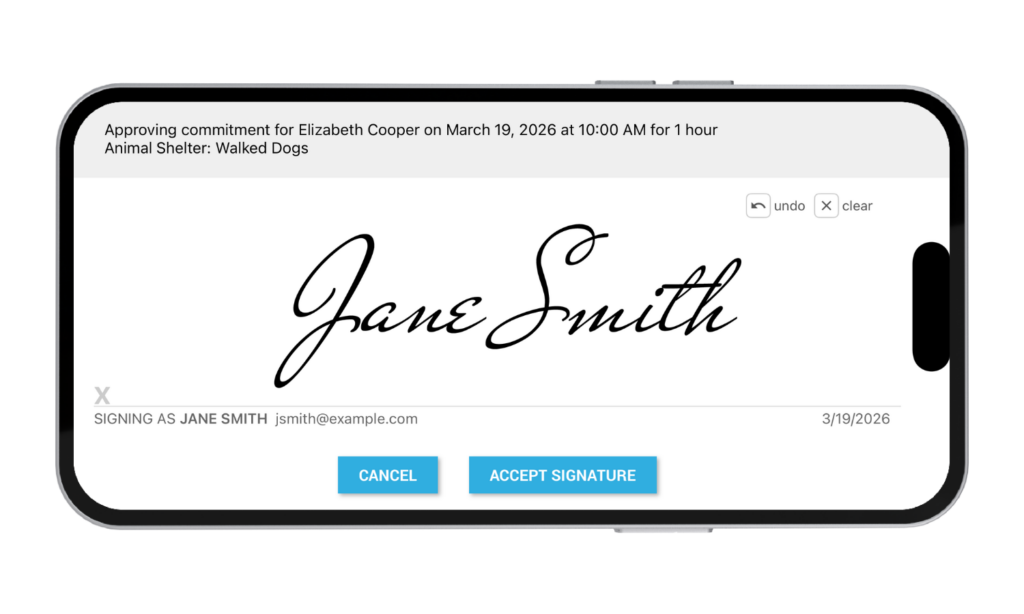 Simple text and email verification allows for organizations to easily validate volunteer time without having to sign off on a bunch of forms..