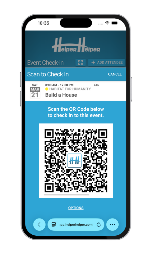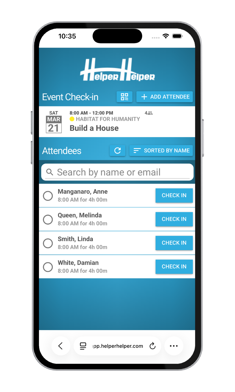 Every event in Helper Helper has a check-in link. This link can be accessed from any internet capable device (you don't not need to be a Helper Helper user to access the link). The check-in link allows for quick one click check in and allows for the event coordinator to edit and add users to the event.