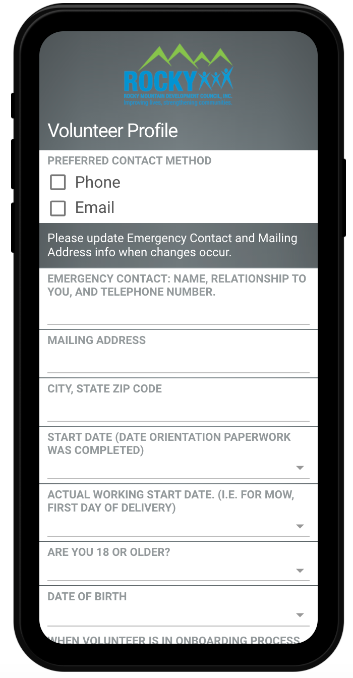 Rocky Mountain Development Council, Inc. is a nonprofit organization that strives to improve quality of life and promote self-sufficiency for individuals and families. They do this by offering programs addressing community needs including energy assistance, food and nutrition, senior volunteer opportunities, housing and community development, senior information services, Rocky Mountain Head Start, and Rocky Mountain Preschool Center. In order to keep these programs running RMDC relies on the help of community volunteers. Before the pandemic volunteers had been managed through a spreadsheet and file cabinet. This made it difficult to find documents as they were needed. It also was hard for multiple people to access and correctly use and maintain the volunteer data.