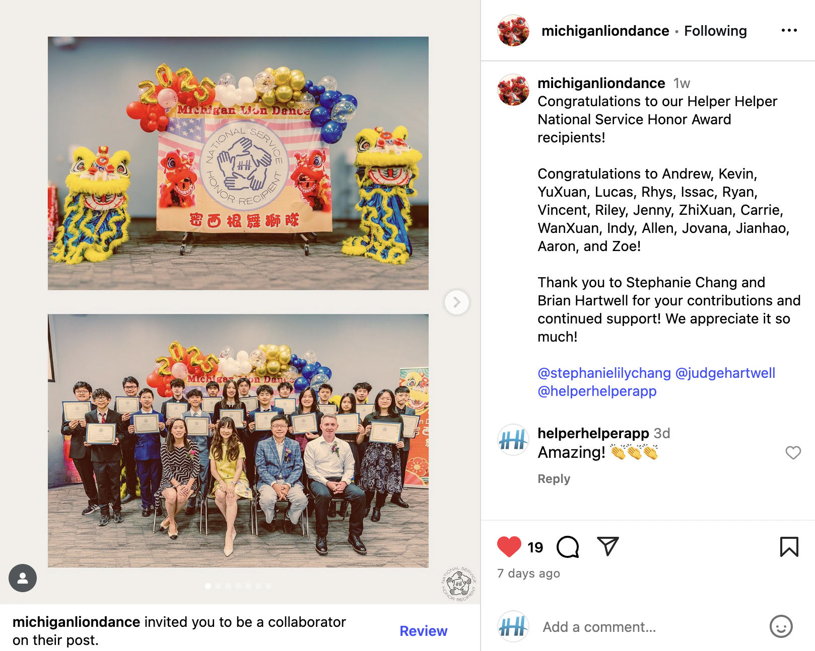 Even in its early launch stage, interest in the National Service Honor has been overwhelming — especially from educators and service coordinators who previously relied on the PVSA. Many are relieved to have a credible, mission-aligned option again and are thrilled to recognize their volunteers. See below a the Michigan Lion Dance Recognizing their volunteers.