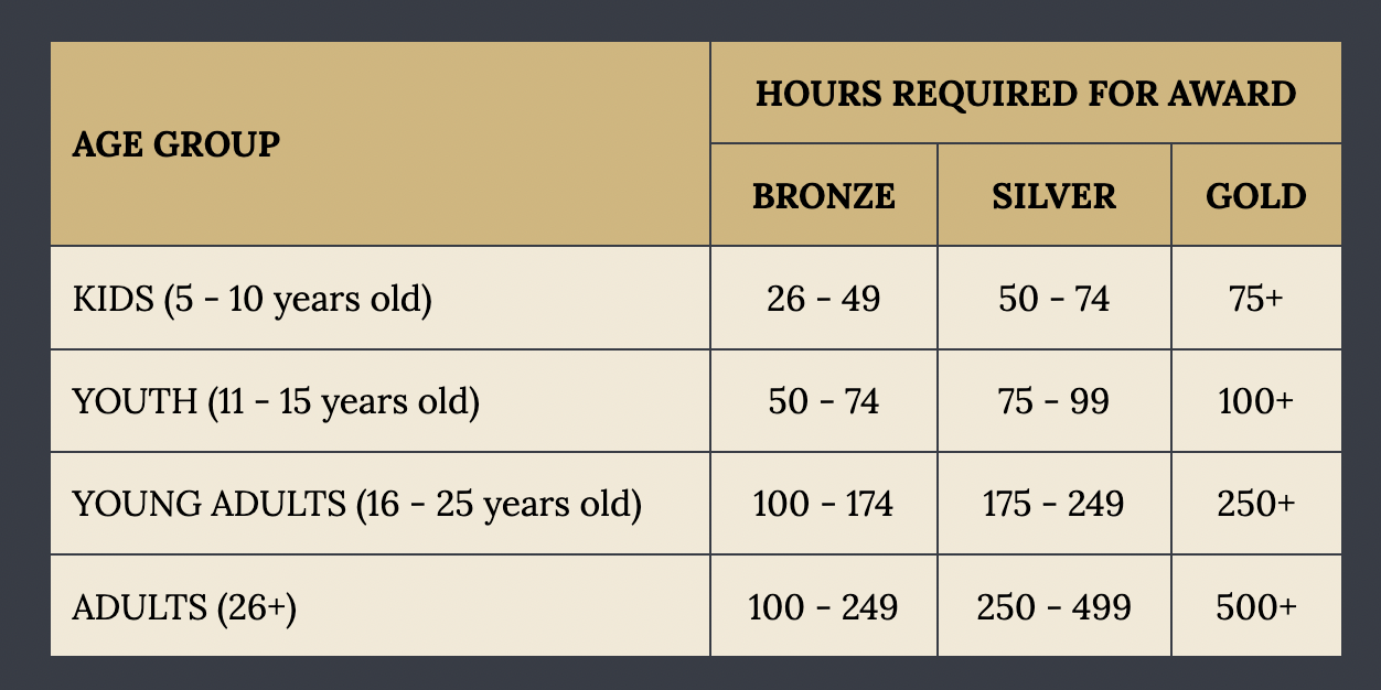 Whether a student volunteers through a school, a family serves together at local nonprofits, or an adult gives back to their community — there is a pathway for recognition.
